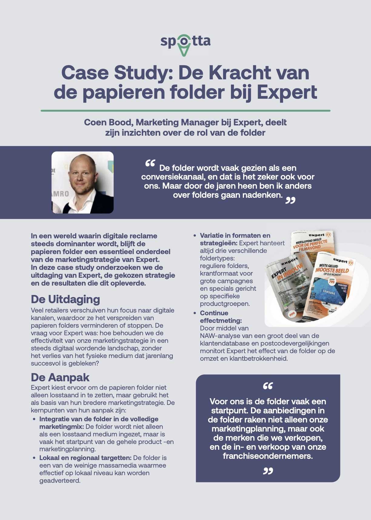 Bij Expert weten ze het zeker: een folder in het folderpakket van Spotta is een vast onderdeel is van de marketingstrategie. Coen Bood, Marketing Manager bij Expert: ‘Folders worden door veel marketeers als ouderwets gezien, maar dat is lang niet altijd terecht.’ Die aanpak heeft mooie resultaten opgeleverd voor Expert. Klik hier om de case study te downloaden.