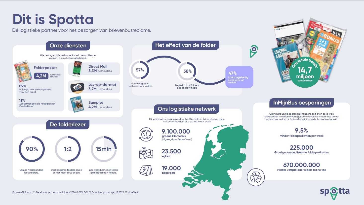 Elke week bereiken we miljoenen huishoudens in Nederland met brievenbusreclame in verschillende vormen: van folderpakketten samengesteld voor buurten tot gepersonaliseerde pakketten en direct mail. Met ons landelijke netwerk en datagedreven aanpak zorgen we ervoor dat consumenten precies die brievenbusreclame ontvangen die voor hen relevant is. Bekijk in onderstaande infographic de meest recente cijfers rondom ons bereik, logistieke netwerk, InMijnBus platform en diensten!